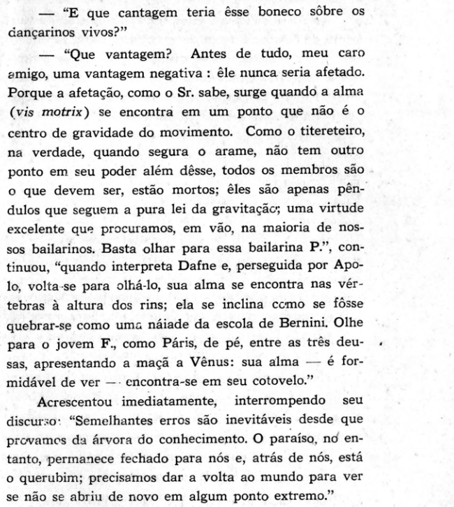 É de 1810 esse texto do Kleist, “Sobre o teatro de marionetes”, que tem várias traduções para o português, no Brasil e em Portugal, e que faz do centro de gravidade de um corpo a sua alma, como quem trouxesse para o teatro e a dança as consequências de Newton.