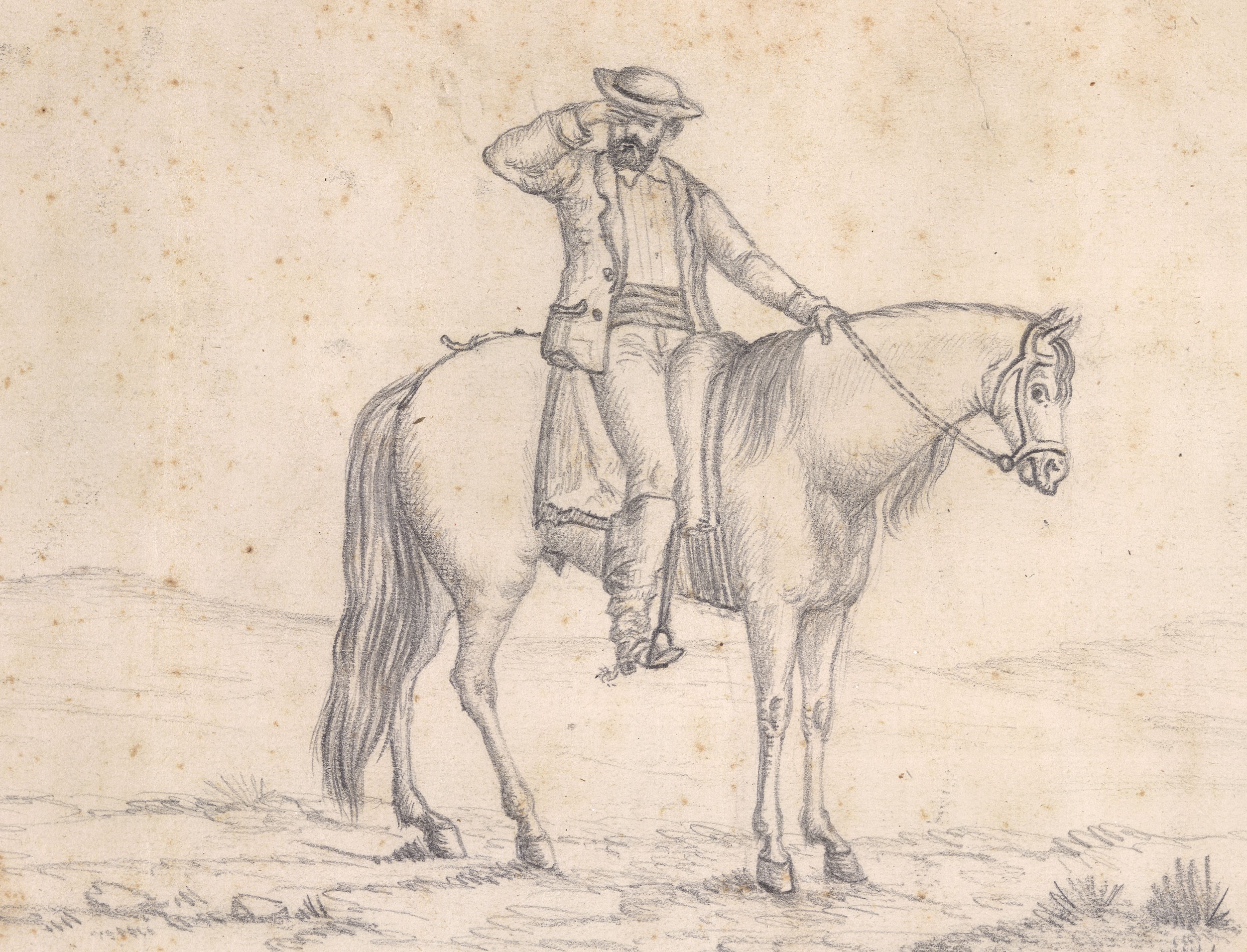 O desenho de Castro Alves chama a atenção pelos traços e pelo tema: romântico na solidão do campo e na corpulência do cavalo (de cabeça pequena) em relação ao homem, realista no estilo nítido com volume arredondado dos traços, na pose das figuras (o olhar fixo do homem nem por isso é profundo à paisagem) e na escolha por representar o homem rústico, ainda que elegante.