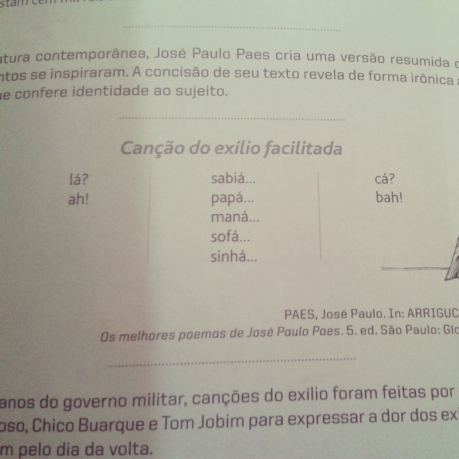 Apesar de acertar os versos, o segundo livro nem por isso acertou o título, que é “Canção de exílio facilitada”. Além de dar margem à exploração da semântica do artigo definido (e da ausência dele), é sobretudo a generalização do exílio pelo título que confere um tom pungente e pessimista ao poema, pois foi justamente no período de virada da década de 1970 que se multiplicaram os exilados políticos da ditadura. O poeta oferece como que um manual poético não apenas às paródias anteriores, como também aos exilados, que não deveriam se comover tanto com a falta do Brasil nos seus aspectos mais confortáveis (“papá”, “maná”, “sofá”) mas sustentados pela “sinhá”. Aos que deixaram o Brasil, que não repetissem a saudade romântica, ela própria alimento do slogan: “Ame-o ou deixe-o”.