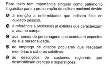 Essa questão, embora possa ser identificada como uma questão “de literatura”, está associada aos estudos de introdução à linguagem no documento Matriz de Referência Enem, do Inep. A Habilidade 20 descrita no documento prevê: “Reconhecer a importância do patrimônio linguístico para a preservação da memória e da identidade nacional”. O termo “patrimônio linguístico” é recorrente nos enunciados de questões do Enem como essa, que se repetem ano a ano. Embora mobilize a habilidade de leitura de um texto literário complexo e se torne mais fácil de ser resolvida com o conhecimento prévio da obra de Rosa, a questão se dedica a testar uma habilidade de reconhecimento da diversidade cultural do país através da língua.