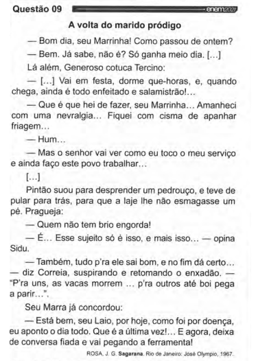 Nesse ano de 2021, não foi diferente. Há algumas questões que abordam textos literários em relação a saberes linguísticos ou culturais, como, por exemplo, uma dedicada ao conto “A volta do marido pródigo”, de Guimarães Rosa, que demandou o reconhecimento do uso de provérbios como traço de estilo relevante para a preservação da cultura popular.