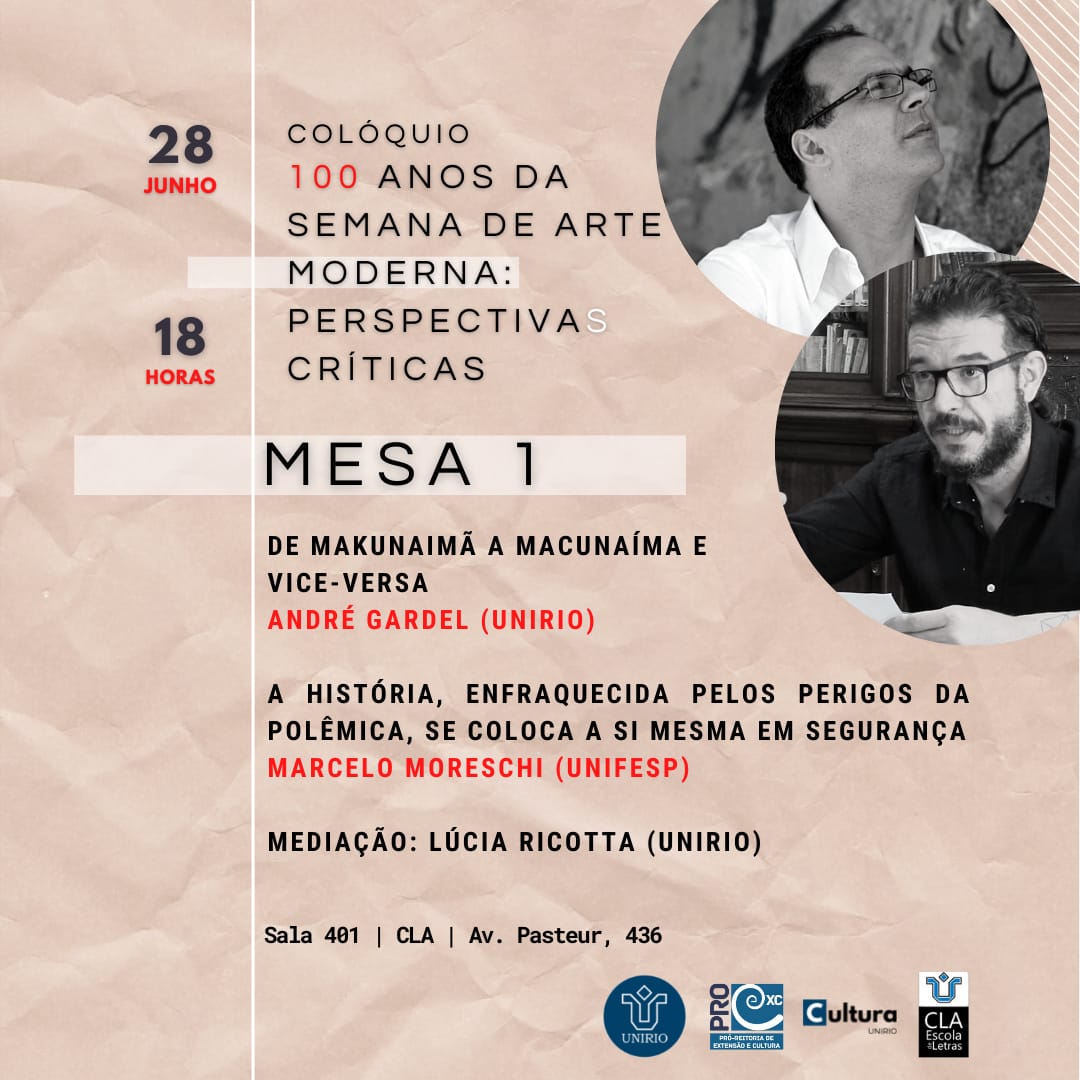 No dia 29 de junho de 2022, fiz uma intervenção no Colóquio 100 Anos da Semana de Arte Moderna: Perspectivas Críticas, na Escola de Letras da UNIRIO, a convite da professora Luciana Vilhena, a quem agradeço a confiança. Dividi a mesa com o professor Zeca Ligièro, que apresentou sua perspectiva da performance afro-ameríndia, conceito importante que concebe e desenvolve.