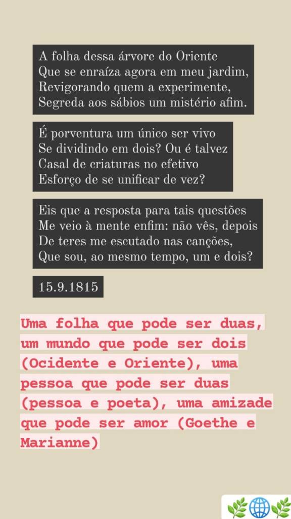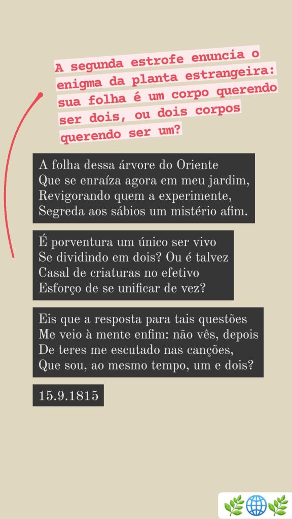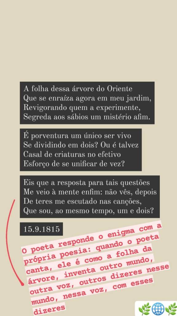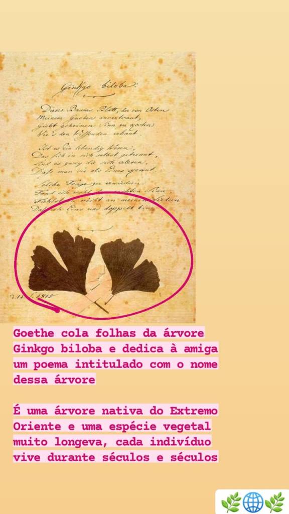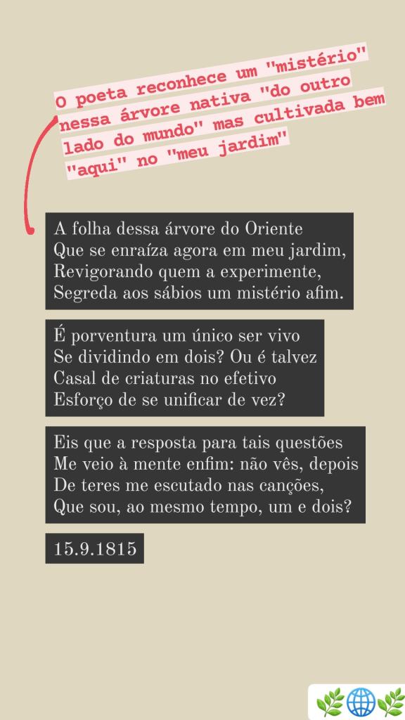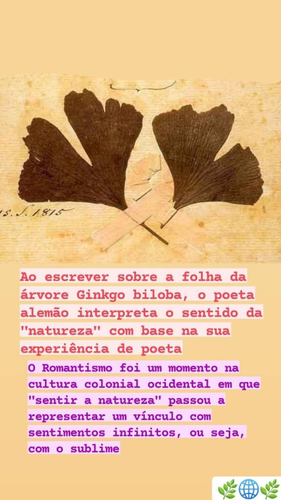 Ao elaborar essa ideia, li com meus alunos um poema de Goethe, poeta romântico alemão. Percebemos como a folha de uma árvore do Extremo Oriente do planeta, a Ginkgo biloba, foi representada por Goethe como símbolo do cosmopolitismo, ou seja, da integração cultural dos povos. Assim, um poeta romântico europeu entendia a literatura como prática de pacificação dos processos de colonização e globalização das culturas.